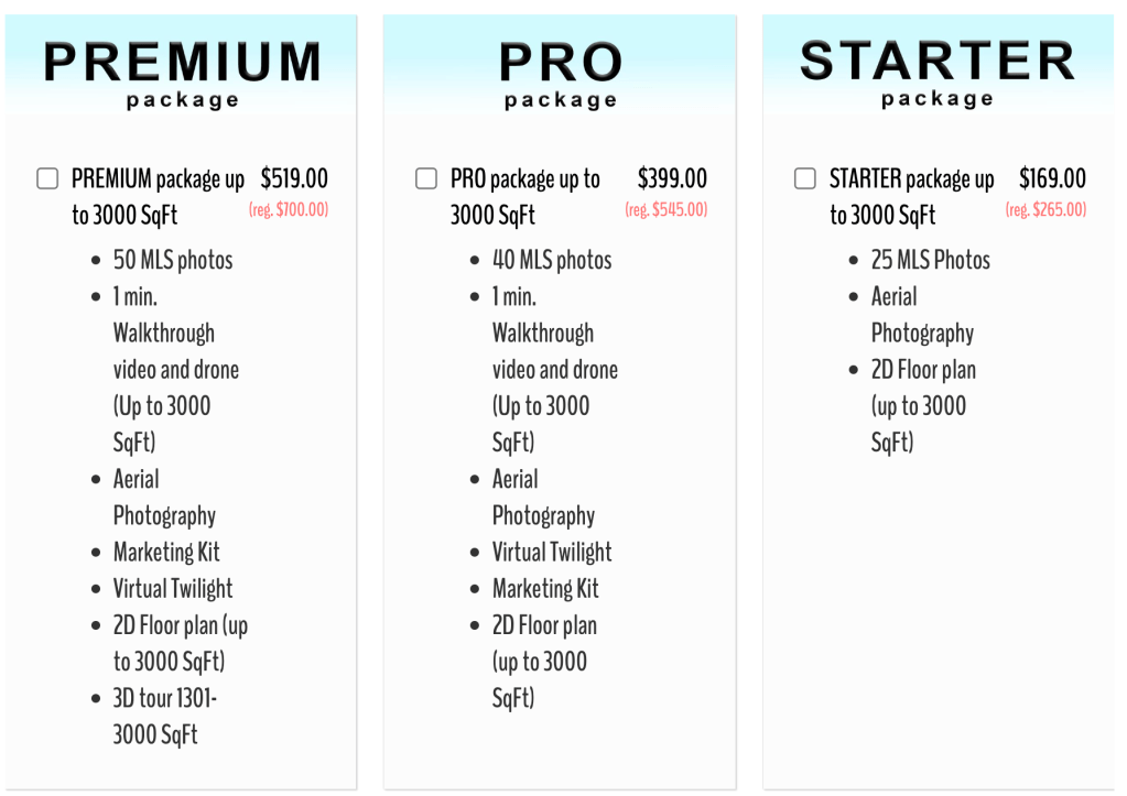 For properties over 3,000 SqFt, custom quotes with only a small incremental on cost for floor plans, video and 3D virtual tours are available on our ordering page.